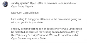 Igboho said the open letter became necessary due to harassment youths are being subjected to in the state. He demanded that no son or daughter of Yoruba Land be molested or harassed for wearing Yoruba Nation outfits by the DSS or any security personnel.