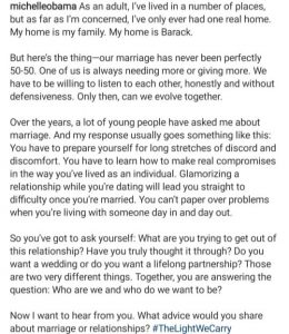 Michelle Obama took to Instagram to offer marriage advice, using her own marriage as an example.