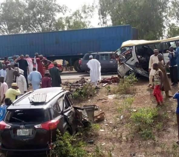 A resident in the area, Mallam Abdullahi Tanimu said that a head-on collision happened when the trailer swerved in a bid to avoid a pothole and then crashed into an oncoming bus.