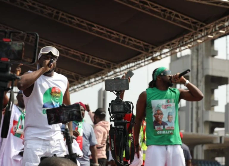 The Psquare brothers are among the entertainers that turned up at the finale of Peter Obi’s campaign ahead of the general election.