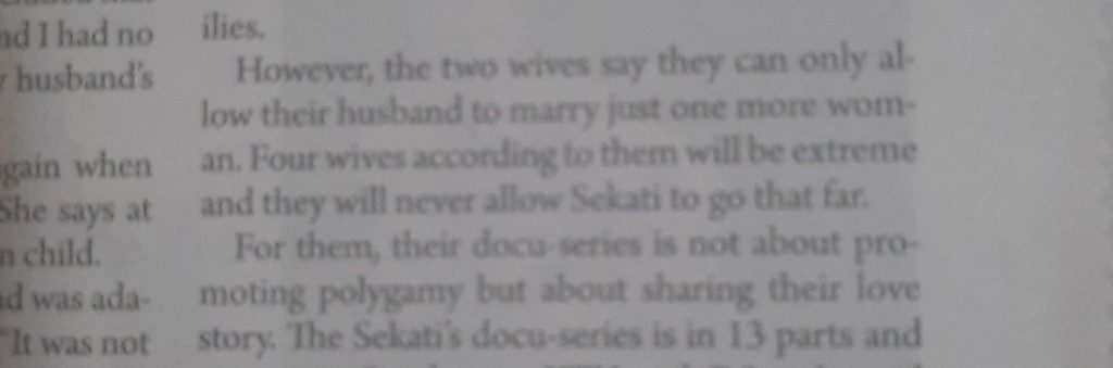 Mpho and Kagiso, who disclosed this in an interview, said four wives would be extreme and they would never allow Sekati to go that far.