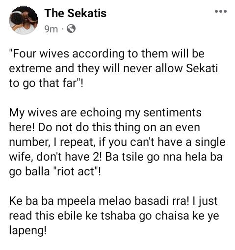 “My wives are echoing my sentiments here! Do not do this thing on an even number, I repeat, if you can’t have a single wife, don’t have 2! Ba tsile go nna hela ba go balla “riot act,” he wrote.