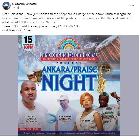 “Dear Celestians, I have just spoken to the Shepherd in Charge of the above Parish at length. He has promised to make amendments to the posters. He has promised that the said contested artists would NOT come for the Nights. There is No doubt the said poster is very CONDEMNABLE. God bless CCC. Amen.”
