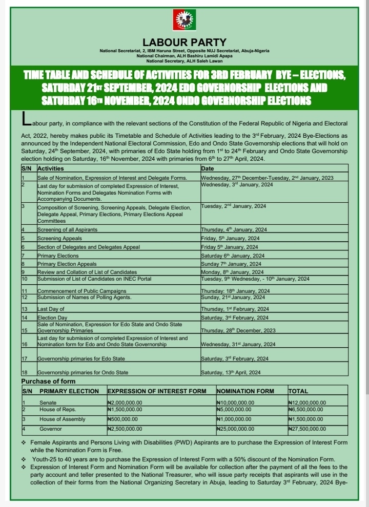 Meanwhile, Labour Party has unveiled the timetable and schedule of activities for the upcoming 2024 Bye-Elections, following the announcement by the Independent National Electoral Commission for the National and State Assembly bye-elections and that of Edo and Ondo state Governorship election