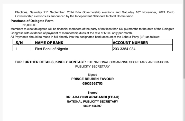 The Announcement said Members of the Labour Party who want to participate in the forthcoming elections as gubernatorial candidates in Edo and Ondo state are to cough out a whopping sum of 27 million Naira for Expression of Interest and Nomination Forms.