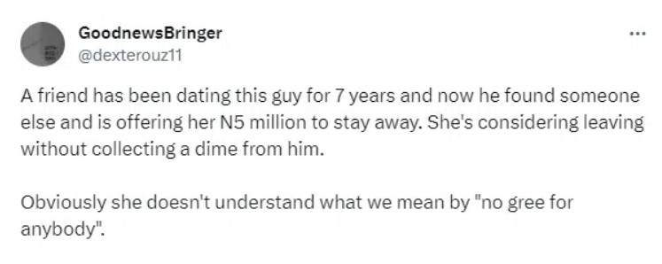The post reads; “A friend has been dating this guy for 7 years and now he found someone else and is offering her N5 million to stay away. She’s considering leaving without collecting a dime from him.”