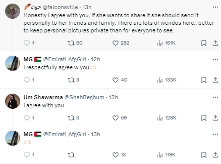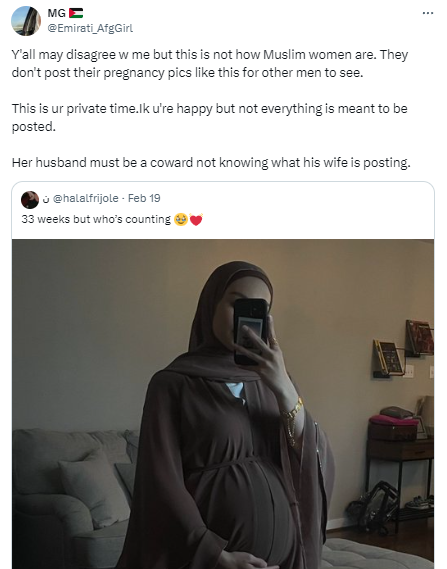 “Y’all may disagree w me but this is not how Muslim women are. They don’t post their pregnancy pics like this for other men to see. This is ur private time.Ik u’re happy but not everything is meant to be posted. Her husband must be a coward not knowing what his wife is posting,” one X user wrote.