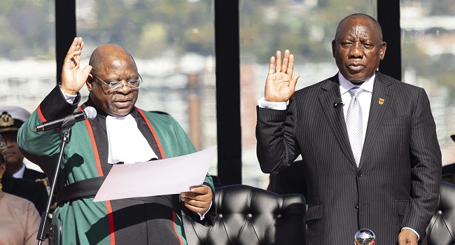 Chief Justice Raymond Zondo led Ramaphosa’s oath of office ceremony before lawmakers, foreign dignitaries, religious and traditional leaders and cheering supporters at the Union Buildings, the seat of government.