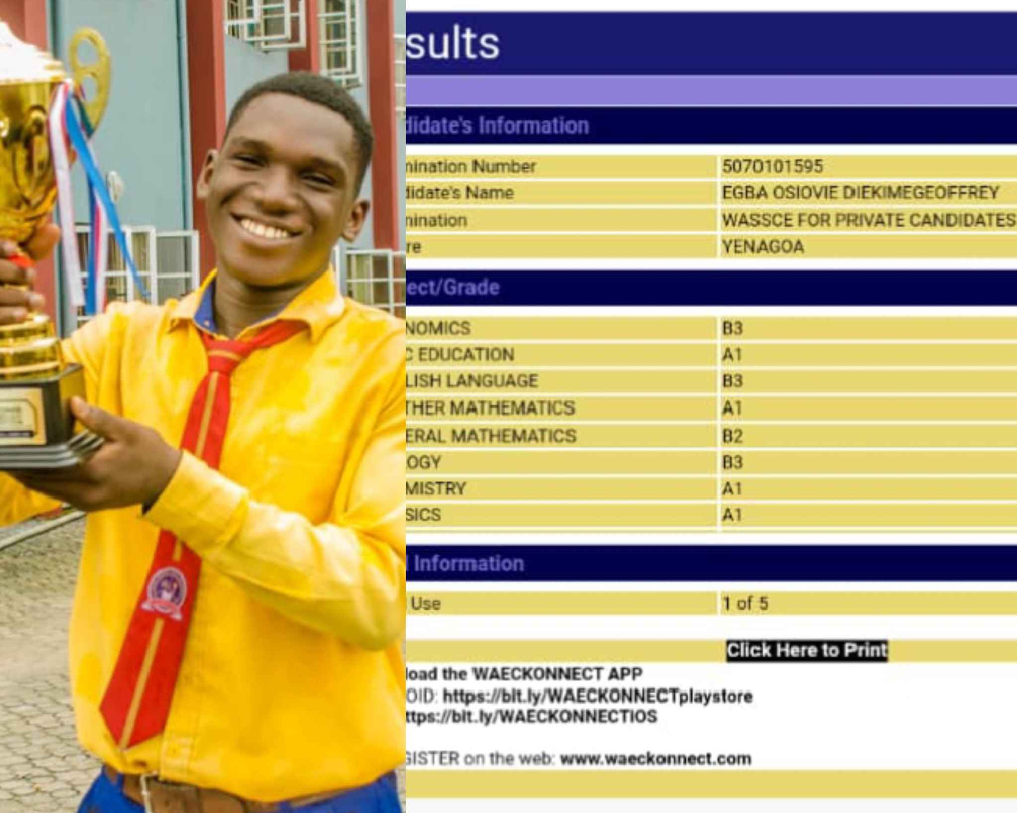 He is a student of Best Breed International Schools, Okaka, Yenagoa, Bayelsa State and made 4 As and 4 Bs in GCE.