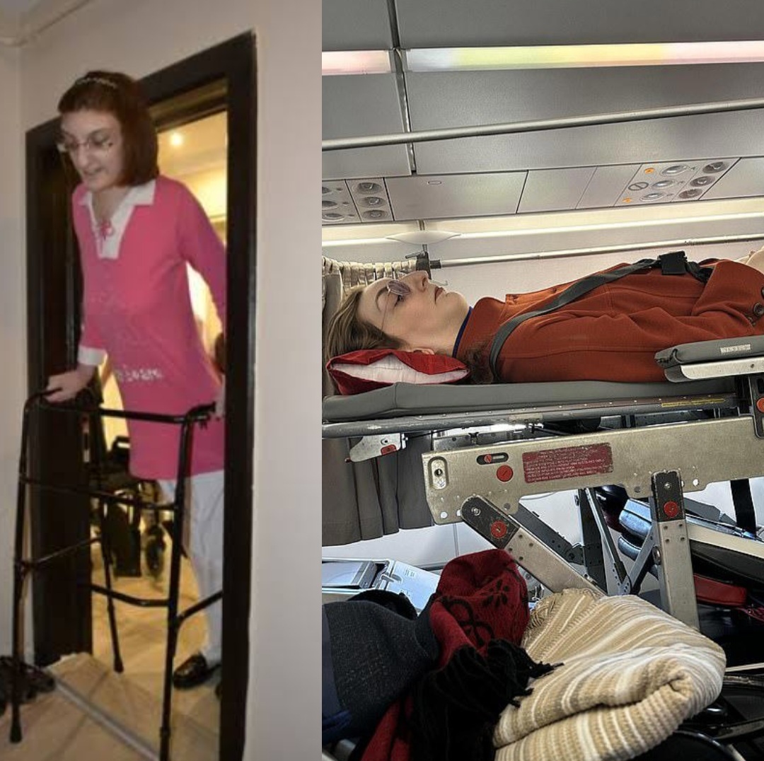 Since she can’t sit down regular airline seats, Rumeysa has to be stretchered onto the plane and spend the entire flight lying down