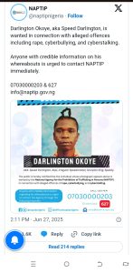 The National Agency for the Prohibition of Trafficking in Persons (NAPTIP) has declared controversial entertainer, Darlington Okoye, better known as Speed Darlington, wanted over alleged offences including rape, cyberbullying, and cyberstalking.