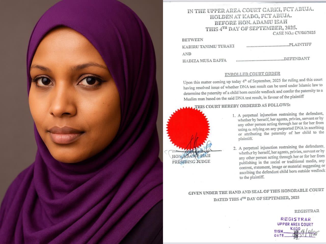 The court then ordered as follows: 1. “A perpetual injunction restraining the defendant ( Baffa), whether by herself, her agents, privies, servants or by any other person acting through her or for her from using or relying on any purported DNA in ascribing or attributing the paternity of her child to the plaintiff (Turaki). 2. “A perpetual injunction restraining the defendant (Baffa), whether by herself, her agents, privies, servants or by any other person acting through her or for her publishing in the social media or traditional media, any content, statement, image or material suggesting or ascribing the defendant’s child born outside wedlock to the plaintiff.”