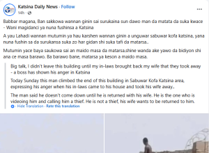 “Sunday this man climbed the end of this building in Sabuwar Kofa Katsina area, expressing his anger with his in-laws who came to his house and took his wife away.