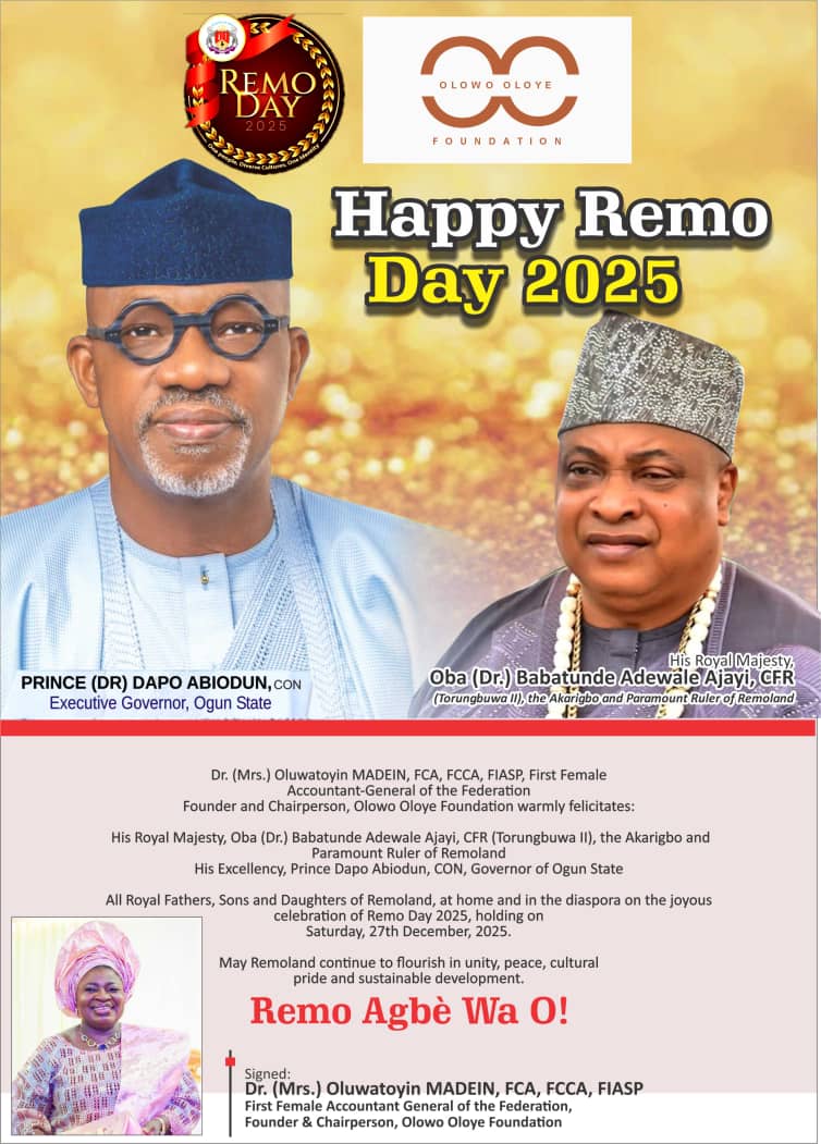 Dr. (Mrs.) Oluwatoyin Madein, the first female Accountant-General of the Federation and an illustrious indigene of Iperu Remo, has felicitated with the Akarigbo and Paramount Ruler of Remoland, His Royal Majesty, Oba (Dr.) Babatunde Adewale Ajayi, CFR, Governor Dapo Abiodun, and the entire Remo nation on the 2025 Remo Day celebration holding on Saturday, December 27, 2025.