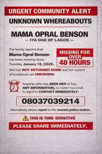 “The family reports that Mama Opral Benson has been missing since Tuesday, January 13, 2026. She has not returned home and her current whereabouts are unknown,” the notice reads.”