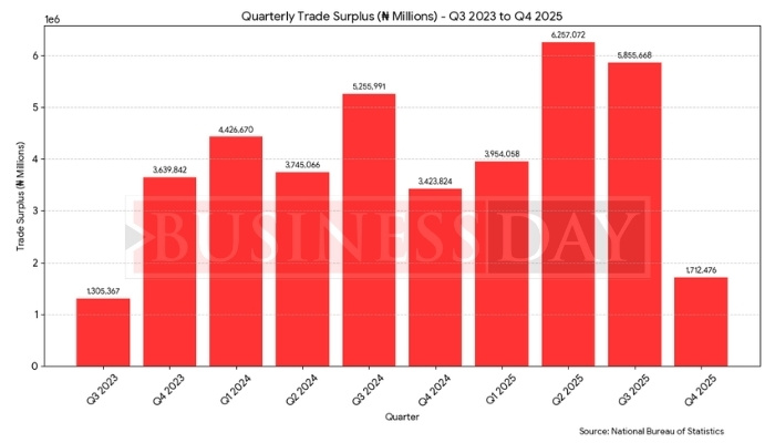Nigeria’s trade surplus fell to its lowest level in about two years in the final quarter of 2025 as a drop in crude oil exports weakened the country’s export earnings, according to new data released by the National Bureau of Statistics.