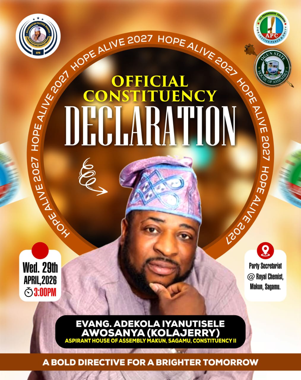 The declaration, scheduled for 2:00 p.m., will hold at the Sagamu Local Government APC Secretariat, located at Royal Chemist, Makun, Sagamu, and is expected to attract party leaders, stakeholders, and supporters from across the constituency.